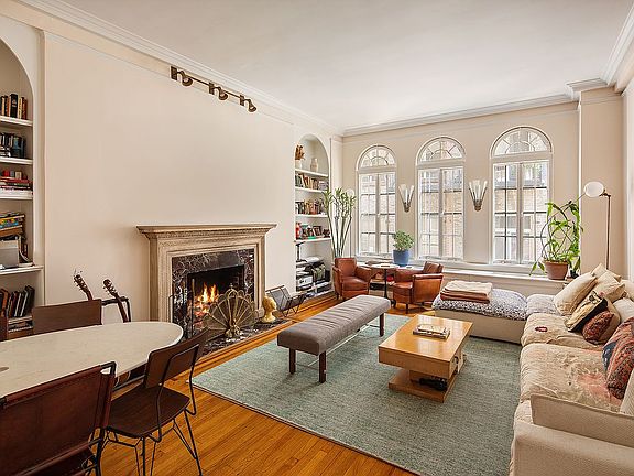 This 6th floor residence for sale is grand in scale with 11ft ceilings and three (3) giant arched top windows. The sunken living room spans 22 feet in length and showcases a marble wood burning fireplace.