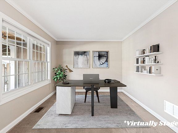 Inside, vaulted ceilings and abundant natural light stretch across the dining room, kitchen, entryway, great room, and additional dining/flex area. The formal dining room features charming custom built-ins and a buffet, while the light-filled office/den overlooks the front yard.
