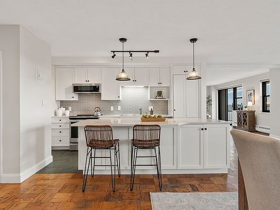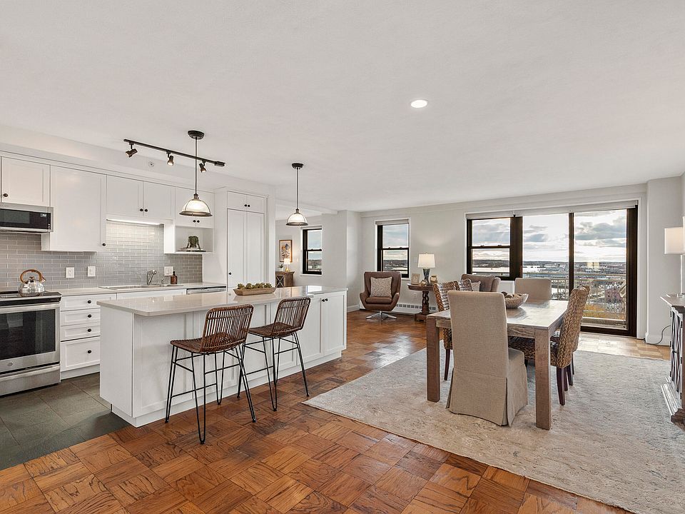 at your doorstep. This exceptional two-unit residence features a bright, open-concept layout designed for both comfort and entertaining. The gourmet kitchen is beautifully appointed with a new granite center island, stainless steel appliances, and a full pantry, the perfect space to gather with friends and family. Step into the living area and be captivated by the breathtaking water views from the expansive private balcony, where tugboats, ferries, and yachts create an ever-changing harbor backdrop. Additional highlights include abundant storage, two