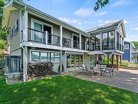 This stunning embankment ranch is one of a kind & offers a unique blend of modern comfort & natural beauty. Step inside & you're greeted by an open floor plan that maximizes the breathtaking water views from every angle. The well-appointed kitchen is a chef's dream, w/ ample storage space & center island where you can cook w/ a view. The main bedroom is a true retreat, offering a serene escape w/panoramic views of the lake & a luxurious en-suite w/ a soaking tub & separate shower. Two add’l bedrms & updated baths. The spacious living rm features cathedral ceiling & wood FP surrounded by shelves. A major highlight of this home is the expansive, heated sunroom w/ cathedral ceiling overlooking the water, providing the perfect setting for relaxation & entertainment. Walk-out lower level has a gas FP, wall of glass & presents endless possibilities. Sonos sound system throughout! Laundry rm w/ an abundance of storage plus a workshop for your tools and toys! Grill is plumbed by natural gas.