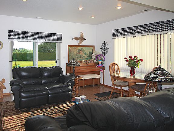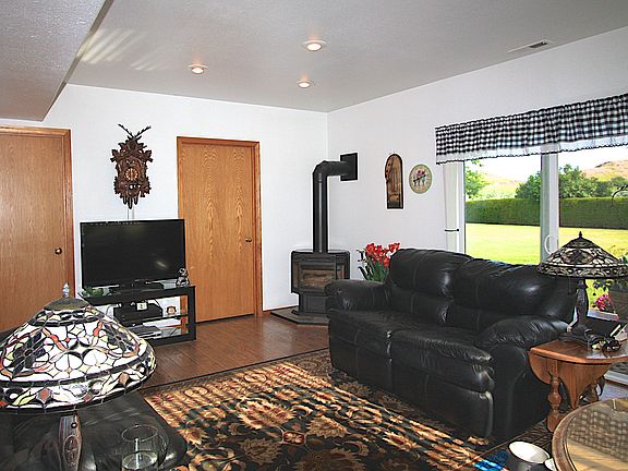 Impeccably maintained 4 bedroom, 2+ bath home located on 3 level irrigated country acres. Open concept featuring kitchen with tile countertops and island. Dining room opens to covered dining/relaxing deck. 3 spacious bedrooms on main floor and additional guest bedroom, family room and adjacent 1/2 bath and shower and cozy propane stove on lower level. Lovely window treatments. 3 spacious garages. Sprinkler system. Park-like grounds surround this special home. Must see to appreciate!