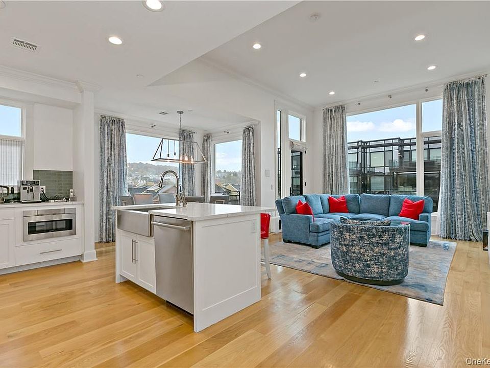 Spectacular designer decorated home at Hudson Harbor on Penthouse level with elevator opening directly into home. River views from this luxury 3 bedroom condo with spacious dining and living room and an open concept living plan with 12' ceilings, floor to ceiling windows & custom wide plank wood floors. Chef’s kitchen features Wolf and Subzero with Caeserstone countertops. Pur water filter system installed for entire home. Two additional bedrooms with custom closets share a bathroom with double vanity. Two balconies with river views offer stunning sunsets. Resort style amenities, outdoor pool, clubroom with kitchen, wet bar, wine room & fitness center. Steps from River Walk, Rivermarket Restaurant, Farmer and the Fish, DeCicco's Market and short walk to Tarrytown train station, and village. This is an opportunity to own on the waterfront with low monthly costs. Also available for rent.