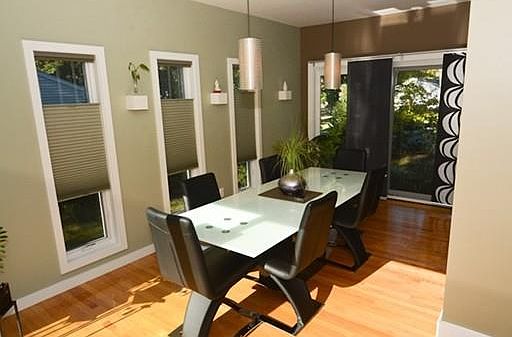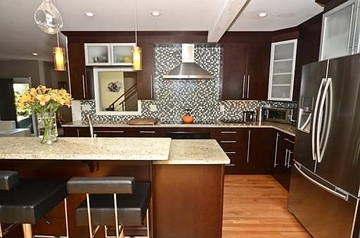 Stylish contemporary home features clean lines, open floor plan, walls of windows with access to the outdoors, and a serene aesthetic throughout. Extensive custom expansion by current owners ~ 2011/12 added: a spacious second floor master bedroom suite with walk-in closet and spa-like 17' x 10' bath; an additional second floor bedroom with en-suite half bath; and wrapped the open flow dining room and large family room around the kitchen. The renovated cook's kitchen has granite counters, abundant cabinetry, mosaic tile backsplash, and stainless appliances. Additional updates include HardiePlank cement board exterior and new roof (2012); one new hvac zone (2012); and renovated first floor full bath with skylight (2015.) This energy efficient home features solar photovoltaic panels and reduced electric bills. Sited on a corner lot along a winding side street, yet close to public transportation, stores, and restaurants.