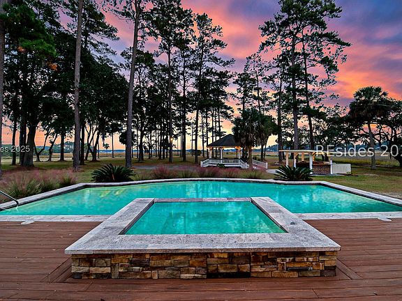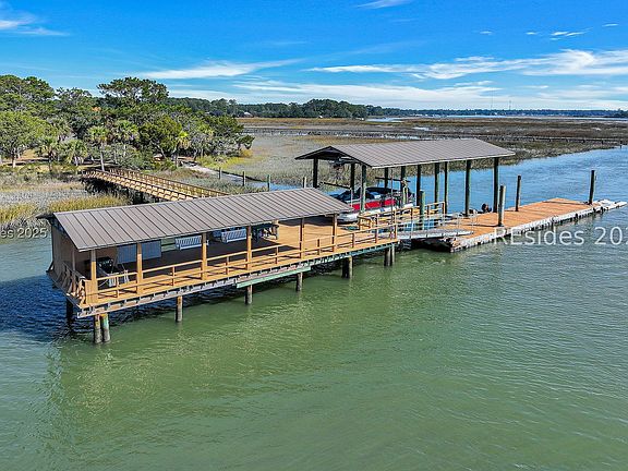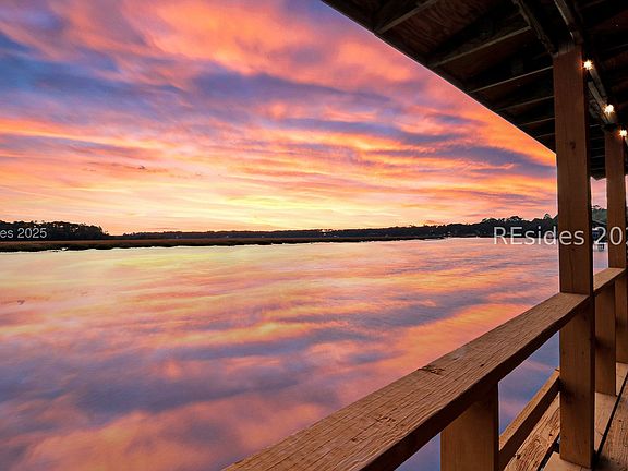 A rare Lowcountry treasure, this exceptional 13 acre estate spans sweeping marsh and May River frontage and features one of the largest residential docks on the river, at an impressive 150 linear feet. Recently reimagined with a remarkable transformation, this grand property offers a level of scale, privacy, and craftsmanship that truly must be experienced in person. Inside, the main level hosts five spacious bedrooms and four redesigned bathrooms, all thoughtfully designed for effortless single level living. The kitchen has been expanded greatly and flows effortlessly into the expansive great room while an additional poolside living space provides a favored riverfront place of respite. Upstairs, a fully appointed apartment wrapped in rich heart pine paneling provides additional living space with endless views that stretch across the tidal waters. Everywhere you turn, the landscape steals the show. With its unmatched acreage, expansive waterfront, and extraordinary dock, the potential to shape a legacy property for generations to come is unmistakable. This is Lowcountry living at its most timeless, gracious, and unforgettable.