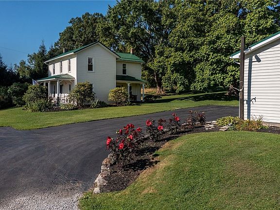 Secluded beautifully done 3 bedroom Farmhouse on nearly 10 acres very near the Shenango Reservoir. Drive down your long private lane you will notice the pristine Manor, a 4+ car Garage, and an exceptional heated workshop/outbuilding area. Even elderberry and blueberry patches and a Spring House await. As you enter the side covered Porch from the driveway to the Kitchen area, noting the gas fireplace with stone mantel and even the stone baseboards. A large Living Room and Dining Room area, first floor laundry and a nicely remodeled full Bath all on the first floor. Three entrances from the front, back and side of the house with their own distinctive porch areas. Upstairs are 3 Bedrooms, including the primary, with beautifully done natural hardwood floors, warm tones and plenty of natural light from the tall windows. Mechanicals include electric heat pump, central air, and a Generator system. A must see for the outdoor enthusiast wanting that little private paradise to call home!