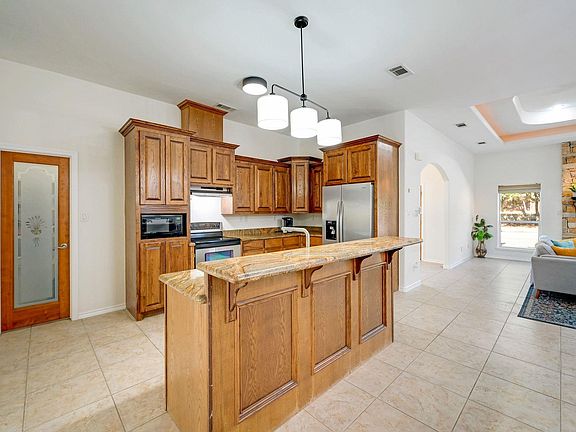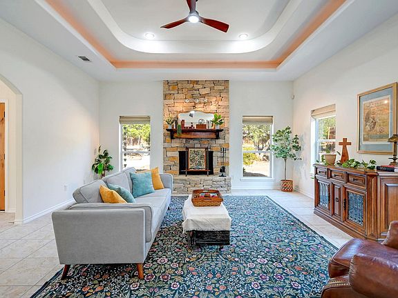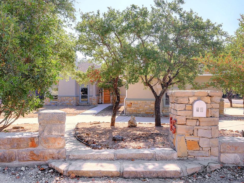 Hill Country meets Mediterranean. This unique home sits on the corner of Longbow and Valley Springs and makes the very most of the corner lot. It features a side entry garage facing Valley Springs and a circle driveway facing Longbow. When you walk towards the front door you are greeted with a courtyard and stone fountain. As you enter the home you will notice the barrel ceiling in the foyer. Down the light filled hallway to the right are two large secondary bedrooms, each with their own bathrooms, along with a half bathroom and laundry room. On the other side of the foyer is a large living/dining/kitchen area. Centered in the living room is a dry stacked wood burning fireplace. The kitchen is open to the living and dining area and has beautiful granite countertops, stainless steel appliances, a walk in pantry and wood cabinetry. Towards the back of the home is a large primary bedroom, primary bathroom with walk in shower, jetted tub, two walk in closets, and double vanities. In the backyard is a covered porch, open decking, storage shed and firepit. This home has been filled with many memories and is ready for its next owners.