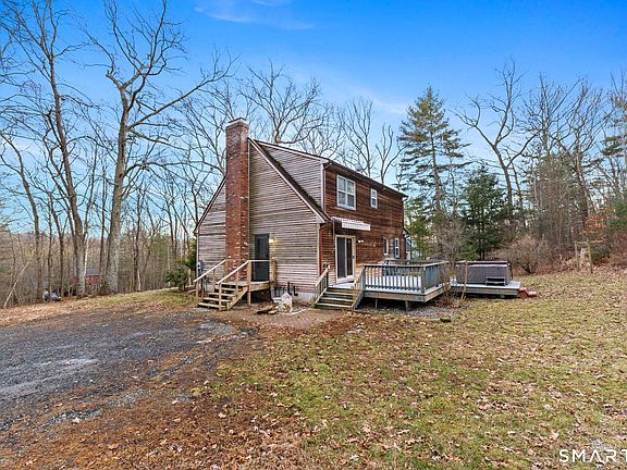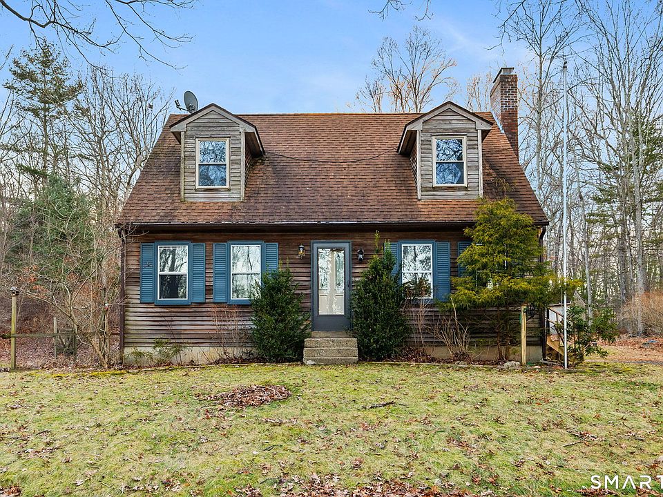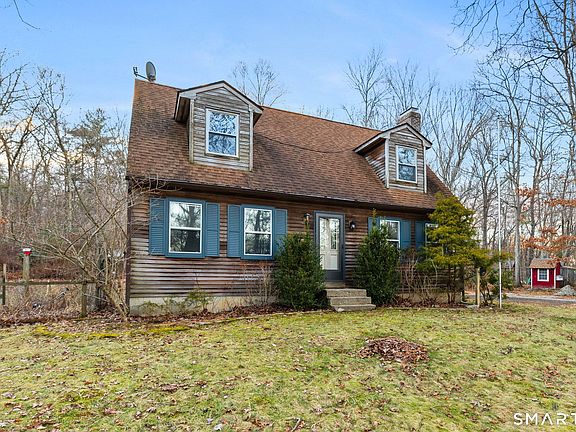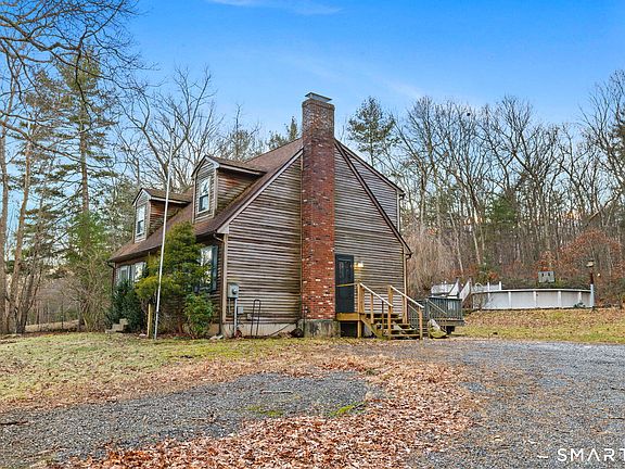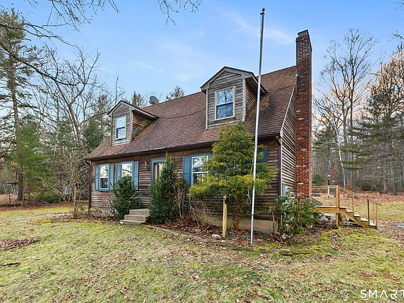 Tucked away on 3.4 lightly wooded acres, this inviting Cape Cod style home offers a rare blend of privacy, comfort, and everyday ease in a peaceful Willington setting. The sun filled main level features an open, welcoming layout anchored by a warm living room with hardwood floors and a charming wood stove, creating the perfect spot to unwind. The kitchen and dining area flow effortlessly together with granite countertops, a breakfast bar, tile flooring, and sliders that open to the deck, ideal for indoor outdoor living. A main level primary bedroom adds convenience, while two additional bedrooms upstairs provide flexible space for guests, home office use, or creative pursuits. Both full baths feature classic tile finishes, with the main level bath offering laundry units already hooked up for added functionality. The partially finished basement provides bonus space for storage or hobbies, and outside, the deck, above ground pool, and shed invite you to enjoy the surrounding natural landscape. Quiet, private, and thoughtfully laid out, this home delivers relaxed country living with all the essentials for year round comfort.