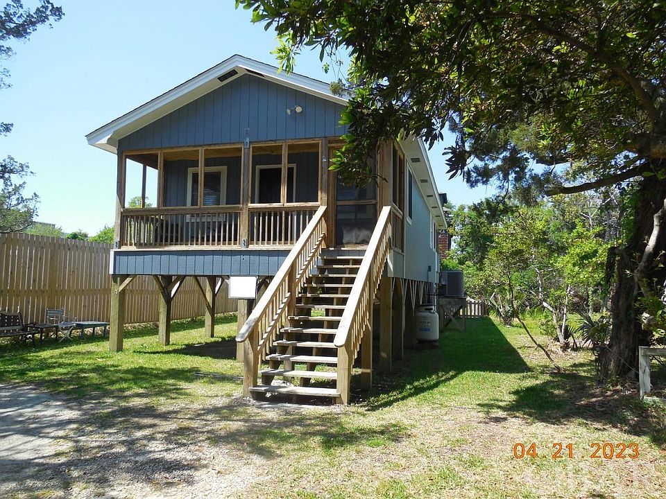A charming 2 bedroom/1.5 bath home on Mark's Path. Located within walking distance to Zillie's, the harbor, many restaurants and shops yet tucked away on a sandy lane lined with live oaks. Open living/dining/kitchen area, full bath off the living area, 2 furnished screened porches (one in front and one in back of the home), 2 gracious bedrooms (one with attached 1/2 bath) each with access to the back screened porch, fenced back yard, shed (underneath the home), central heat and a/c, extra gas pack heater for supplemental heat for the cooler winter nights, ceiling fans, stackable washer/dryer and dishwasher. Lovely grassed back yard with both sunny and shaded areas, a picnic bench and a private outdoor shower. The exterior has just been painted, a new fortified roof was installed in December of 2022, a new hot water heater in January of 2023 and new luxury vinyl installed in the 2 bedrooms in 2022. Proven rental history but would make an easy transition to year round living.