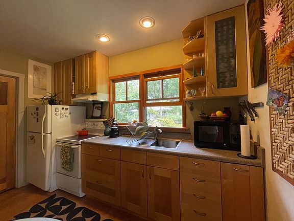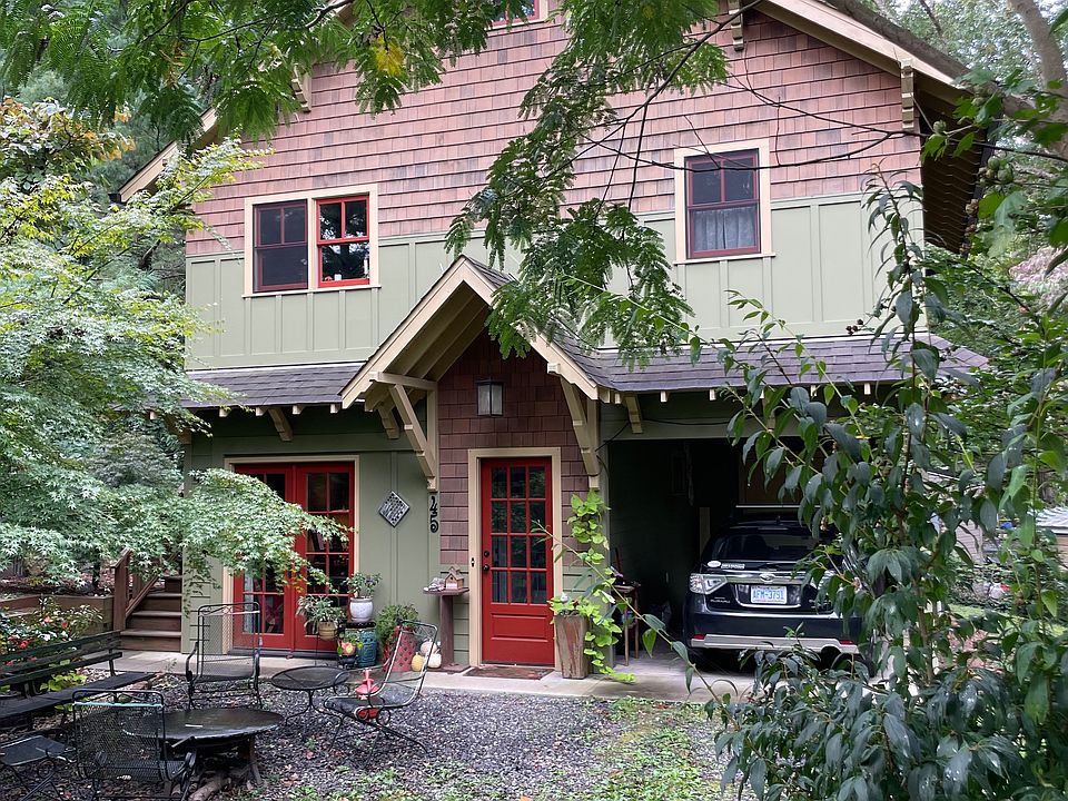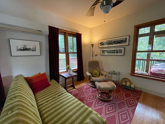 Climb 14 stairs to a unique feel of a tree house. Large windows in the great room face south overlooking lush gardens and provide lots of light. There are bamboo floors throughout with tile bathroom floors and shower. Accent walls in the bathroom and the bed headboard are built using old wooden cabinet fronts and doors up cycled from a nearby cabin. The kitchen has maple cabinets and double windows over the sink and counter. The screened in porch is perfect for an afternoon nap or quiet evenings listening to the owls.