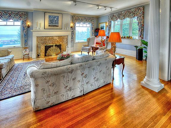 Charming historical home with stunning panoramic views of the Bay, Mt Rainier and Olympics Mountains. 7 bdrms, 5.5 baths, 7 fireplaces. The large entry hall features an elevator serving main, lower & 2nd levels. Gourmet kitchen with Viking dbl ovens, 6 burner gas stove top, large island w/separate sink, pantry & dumb waiter. Spectacular views from the formal living and dining room. Master suite offers walk-in closet & gas fireplace. Mature landscaping, sports court, 2 car detached garage.