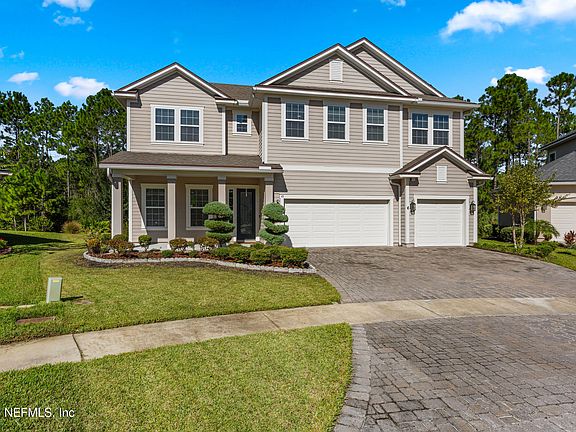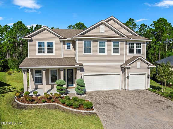 Discover this stunning former model home tucked in an exclusive cul-de-sac community in St. Johns—where top-rated schools, low HOA, and prime location meet. Step inside to find beautiful tray ceilings, elegant light fixtures, and a bright open layout. The gourmet kitchen features quartz countertops, stainless-steel appliances, a large island, spacious pantry, and cozy breakfast area. The primary suite on the first floor offers dual walk-in closets and a spa-style bath with stone shower, garden tub, and dual vanities. Upstairs you'll find a spacious loft, three bedrooms, and a full bath. Enjoy peaceful sunsets from your covered lanai overlooking a serene treeline. With a 3-car garage, new 2025 water heater, smart dual thermostats, and no CDD fees, this home truly has it all—just minutes from Jacksonville, I-95, SR-13, shopping, and dining.