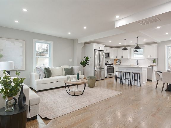 Modern, Sleek and Open Concept Design! This NEWLY renovated home is in a great location and ready for a NEW family to move right in and enjoy the many comforts of NEW. When you walk in you are greeted by an open floor plan that has a stunning fireplace to put you in the mood. You can cook on your gas stove in the BRAND-NEW kitchen w/ quartz countertops, all NEW stainless-steel appliances, & an island perfect for entertaining. Brand-new hardwood floors throughout to the 3 beds and 2 full baths on the 2nd floor. A gorgeous tiled main bath has a tub while the primary bathroom has a stand-up shower also tiled to perfection. You will love staying cool in the summer & warm in the winter with the NEW Bosch hvac gas heat and central air. With all NEW plumbing, electrical, water heater, vinyl siding, roof, gutters, lighting, doors, trim, driveway, decks, plaster and paint. You can walk to the train station but RUN to see this house and make it yours today!