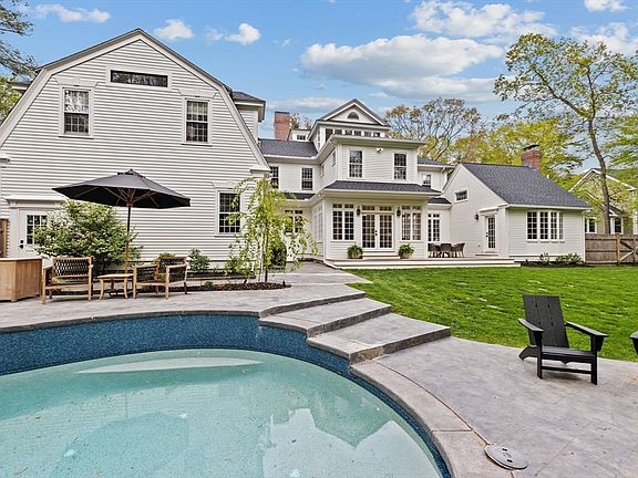 Stately custom colonial set at the end of a serene cul-de-sac just moments from downtown Hingham and the library, this exceptional five bedroom, four bath residence offers over 6,500 square feet of refined living space. Privately sited on a beautifully landscaped lot abutting Triphammer Woods and Wompatuck Park, the home offers timeless architecture, balancing elegant design with everyday functionality. The state-of-the-art kitchen features professional appliances, custom cabinetry, and expansive island, leading into the dining area and fireplaced family room, ideal for entertaining. The luxurious primary suite, accessed by a private staircase, features a beamed, cathedral ceiling, two walk-in closets, and a spa bath. Each additional bedroom enjoys en-suite or direct bath access. The third floor loft with wet bar captures stunning views over the gardens. Outdoors, a heated pool and sweeping stone patio provide a resort-like setting in one of Hingham’s most coveted locations.