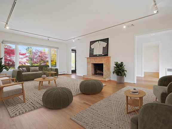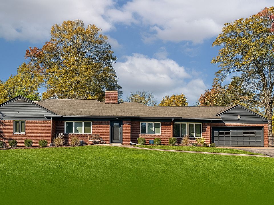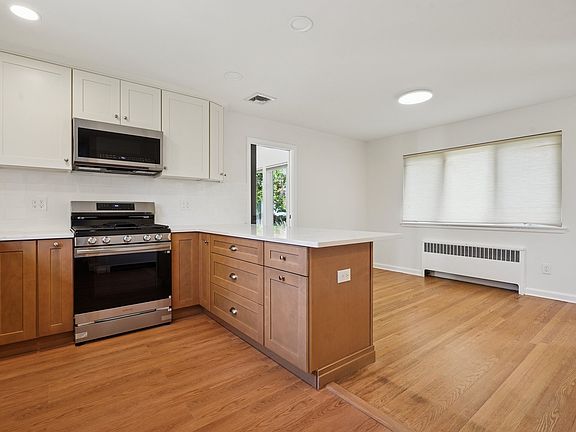 Exceptional mid-century home offering a spacious property and skyline views. Set on a quiet, tree-lined cul-de-sac, this stylish no-step ranch offers modern amenities set across a versatile, flowing floorplan with panoramic windows showcasing skyline and landscape views. The eat-in kitchen has been updated with quartz counters, new cabinetry, and gleaming stainless steel appliances by Samsung. Bedroom spaces are sun-filled with wide windows. Jack-n-Jill bedrooms offer incredible built-in closets and an en-suite bath with soaking tub and shower. The front-to-back living room centers around a marble-faced fireplace. The lower level offers a versatile laundry room/pantry with sink and cabinet storage. A large family room, spacious home gym/office area, a bonus full bath, and storage space complete this level. Outside, a private patio overlooks the sprawling backyard with mature trees and specimen plantings. Freshly painted and gleaming hardwood floors. Close to local business centers, shopping, highways, and transportation to NYC.