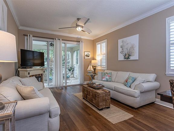 Welcome to Unit 1927, a beautifully updated 2-bedroom, 2-bathroom condo where lush oaks and swaying palms create a serene retreat. From the screened, and tiled 12 x 15 ft. lanai, enjoy views of the Intracoastal Waterway and an emerald lake with a fountain. this condo is embraced by a canopy of oaks and palms, creating a peaceful, shaded private hideaway surrounded by nature. Inside, stunning luxury vinyl flooring, plantation shutters, updated lighting, and modern fans add warmth and style. Sunlight fills every room through abundant windows, creating a bright, inviting atmosphere. All furnishings are negotiable, and the condo can be sold turn-key. The HVAC system replaced in 2020 This condo also includes a 10 x 6 detached storage unit—perfect for bikes, beach gear, and more. For a monthly HOA fee of $775, enjoy resort-style living, cable, high-speed internet, and access to scenic walking paths along the Intracoastal Waterway. There is NO CDD fee or additional amenities fee! This pet-friendly community offers fun social activities, 2 pools (1 heated)pickleball and tennis courts.