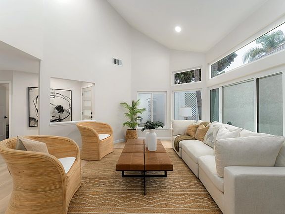 Professionally designed and fully renovated, this single-family home showcases quality finishes throughout and water views of the channel from the primary suite. One of the most private lots in the entire Coronado Cays! Step inside to soaring vaulted ceilings, brand-new windows that fill the home with natural light, and white oak engineered flooring. The gourmet kitchen features custom two-tone cabinetry, Taj Mahal quartzite countertops, luxury appliances, and Delta fixtures. A downstairs bedroom offers flexibility as a guest room, office, or the convenience of single-level living. Enjoy the amenities that come with this community from the pool, tennis courts, club house or large park! Upstairs, the primary suite impresses with vaulted ceilings, a private deck overlooking the channel, a walk-in closet, and a spa-inspired bath with custom cabinetry, Taj Mahal quartzite countertops, soaking tub, and walk-in shower. All bathrooms include Delta fixtures and Kohler toilets. The beautifully landscaped backyard is designed for entertaining with mature greenery, a pergola for outdoor dining, and newly laid pavers surrounding the property. Additional highlights include a two-car garage with generous storage and an upstairs laundry room. Live the Coronado Cays lifestyle at its finest in this move-in ready single-family home.