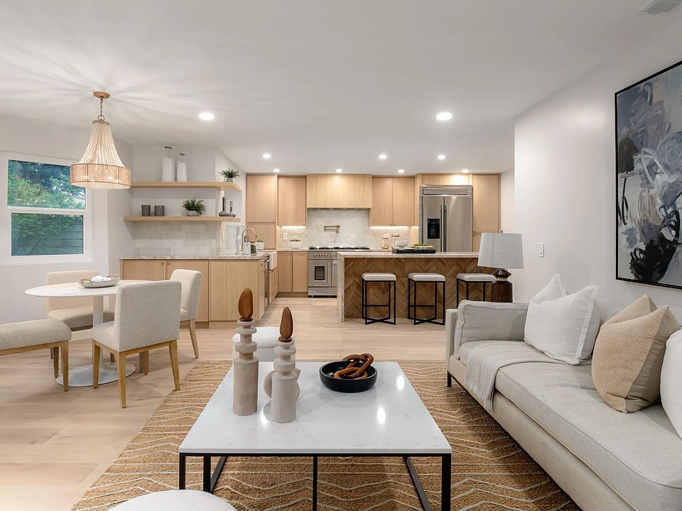Gourmet kitchenMature greeneryDelta fixturesNewly laid paversWhite oak engineered flooringTaj mahal quartzite countertopsPergola for outdoor dining
