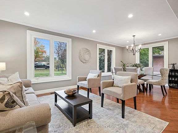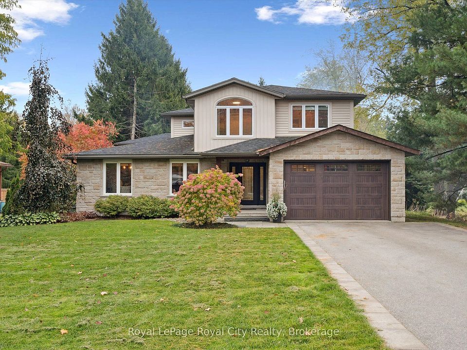 Tucked away on over an acre of peaceful, tree-lined property, this thoughtfully designed multi-level home offers a rare blend of space, style, and soul. From its inviting front porch to the rustic entertaining space out back, every inch of this 5-bedroom, 3-bathroom property invites connection with family, friends, and the natural beauty that surrounds it. Upon entrance, you will quickly fall in love with the open-concept design, enhanced by gleaming hardwood flooring. The chef-inspired kitchen showcases sleek Corian countertops, custom cabinetry, and a functional island that flows perfectly into the combined living/dining room, creating an elegant space for entertaining. A sizable main floor bedroom is ideal for guests or a home office, while a well-equipped mudroom supports busy family living. Descend to the show-stopping lower-level family room, anchored by an attractive fireplace, and flaunting vaulted ceilings, engineered hardwood, skylights, and floor-to-ceiling windows capturing breathtaking backyard views. The adjoining games/rec area is designed for fun and function, complete with heated floors, backyard access, and a modern 3pc bathroom. Upstairs, the 2nd level provides 2 generous bedrooms and a loft space, perfect for a reading nook or study, alongside an updated 4pc bathroom. The private, 3rd level offers a primary suite with a walk-in closet and a 5pc ensuite, as well as a 5th spacious bedroom. The finished basement extends a versatile living or recreational space, complemented by a dedicated laundry room and storage/utility room. Step outside and prepare to be captivated: a 2-tier stone patio frames alfresco dining and a rejuvenating hot tub area, while the rustic post-and-beam gazebo with a striking stone fireplace promises memorable evenings under the stars. Surrounded by mature trees and lush green space, this property evokes the feel of a private resort retreat- just minutes from essential amenities and ready to welcome your next chapter.