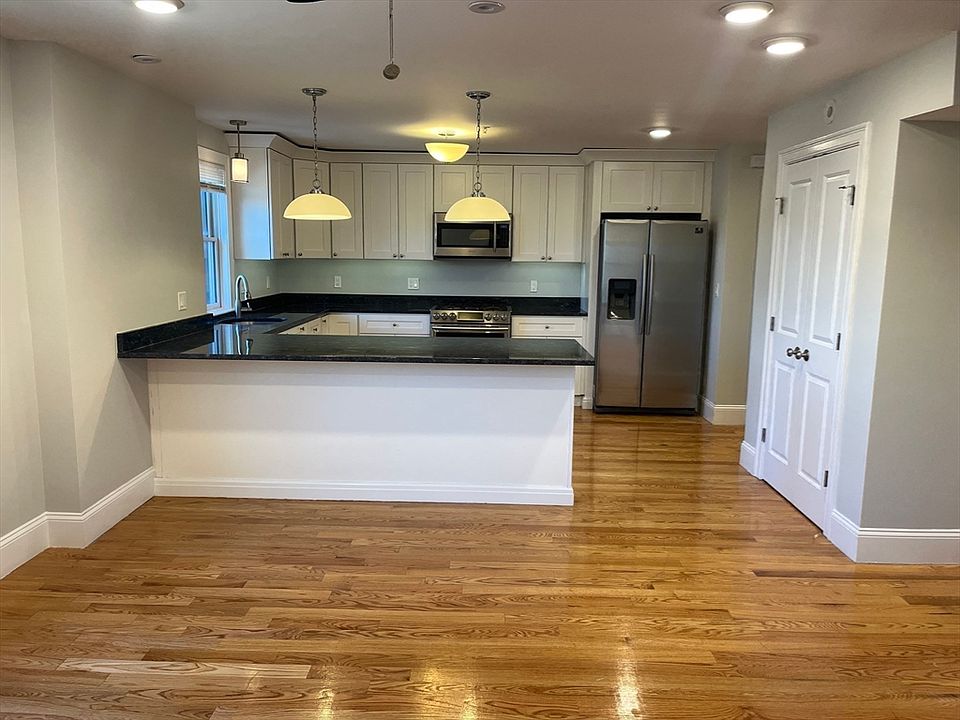 Luxurious one-bedroom apartment offering modern comfort and convenience. This bright and spacious apartment features gleaming hardwood floors throughout, stainless steel appliances, in unit laundry, and central air conditioning and ceiling fans for year-round comfort. The bedroom also boasts custom closets providing excellent storage space. Tenants have access to a shared patio area featuring two gas grills, a fire pit, and a dog play space. One garage parking spot is included. Located close to restaurants, shops, and public transportation, this apartment combines luxury and lifestyle in one of West Roxbury's most desirable neighborhoods.