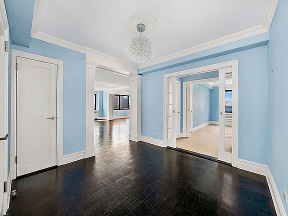 Enter through a gracious square gallery that flows seamlessly into an expansive living room and corner dining room. Oversized windows frame sweeping panoramic views of the East River, 59th Street Bridge, Pepsi Neon Sign, Williamsburg Bridge and the southern skyline, flooding the space with natural light throughout the day.