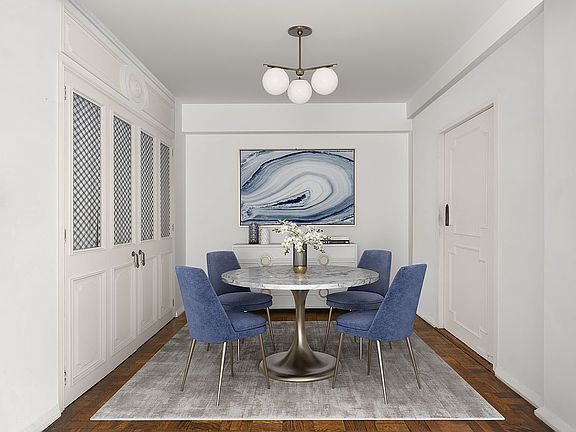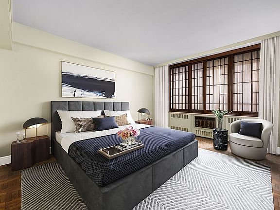 The home offers a wonderful separation of space, leading to the spacious primary and secondary bedrooms. These rooms are bright and large, providing ample room for king-sized furniture and offering excellent closet space for storage. Multiple oversized windows throughout the apartment ensure ample natural light and offer peek views, including a glimpse of the East River.
