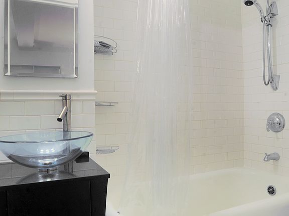 The apartment features black granite countertops and beautiful GE Stainless Steel appliances, including a convection oven, dishwasher, and mini-fridge. In addition, the apartment sprawls with hardwood flooring, and the bathroom features white subway tiling, a granite vanity, and chrome Kohler fixtures. Heat, water, and electricity are inclusive in the rent. Lease term minimum is one year, no pets allowed, and basic financial parameters apply.