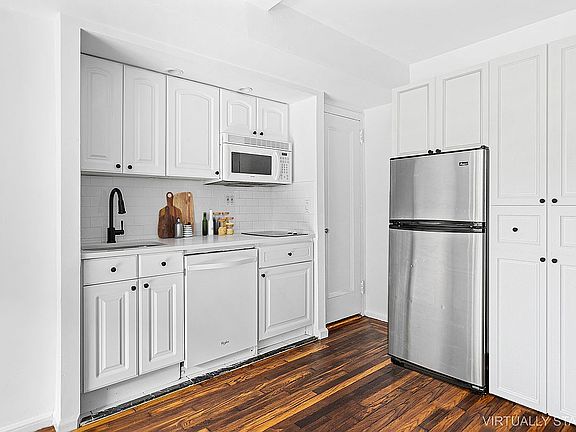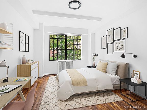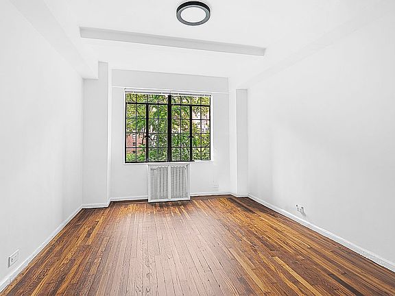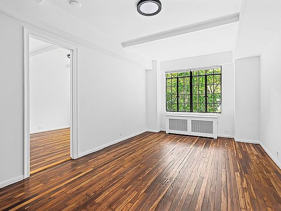 The newly refinished floors are Oak strip, and the beamed ceilings are 8' 6". The floor plan includes a good size living room with space for dining and an open kitchen. The apartment is freshly painted and move-in ready. The kitchen has a new white granite countertop, a full refrigerator, a microwave, and a dishwasher. The kitchen cabinets are white paneling in keeping with the pre-war theme. There is an adjacent closet that serves as an oversize pantry. The large bedroom has a wall of windows, one closet, and an en suite marble bathroom.