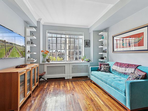 This thoughtfully renovated one-bedroom home captures the best of city living in a serene setting. Overlooking the treetops of Tudor City Greens Park, its western exposure frames iconic skyline views — including the Chrysler Building — through classic pre-war casement windows.
