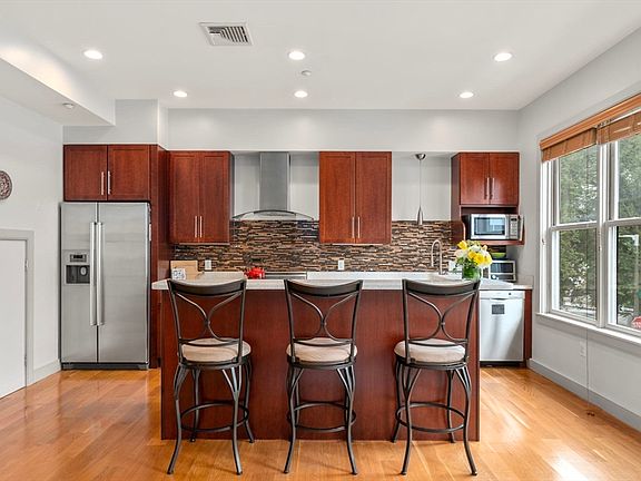 Welcome to 45 Vinton, where Unit 1 sits above street level, filled with natural light, soaring ceilings, and oversized rooms that create a bright, open feel. The flexible layout offers a pocket-door bedroom, perfect for guests or a nursery. Both full baths feature spa-style finishes with rainfall showers, body jets, and a soaking tub. The kitchen features a large island alongside Bosch and Bertazzoni appliances, ideal for any home chef. Step outside to a roof deck with city views, an outdoor shower, and a natural-gas grill—perfect for entertaining or watching the Boston fireworks. A deeded garage space with direct elevator access to your floor makes life easy, while Carson Beach, Moakley Park, and Andrew Station are just minutes away. With F45, Peter Welchs, Bspoke, Hunters, Capo, Lincoln, Fat Baby, Loco within half a mile this home offers the best of city living with comfort, style, and convenience.