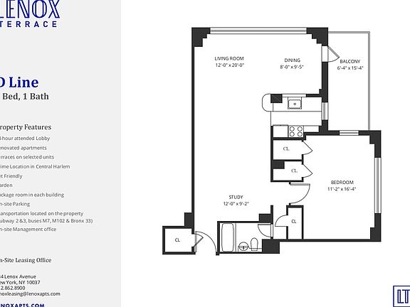 This spacious and sunny Junior 4, one bath offers views to the south. Our modern apartments offer oversized windows that allow great sunlight, individually controlled A/C units, and spacious layouts with great closet space. Peaceful green spaces and local dining and entertainment hotspots are a short walk away, and our courteous 24hr doormen will greet you when you return. Our amenities include: - 24 doormen - Concierge Package Services - On site security - Laundry Room - Parking available at competitive rates - Pet Friendly - Balconies in select apartments** Lenox Terrace is conveniently located close to the 2/3 train, and a 10-15 minute walk to the A/B/C/D 4/5/6 trains and the Metro North. There are a variety of express and local buses that can take residents to locations in and out of New York City, including LaGuardia Airport. There are two supermarkets within one block of the building. Whole Foods is one stop away on the 2/3 train or a 10 minute walk from the building. Lenox Terrace is a short walk to many restaurants, bars, and entertainment. Lenox Terrace is very close to the East River Shopping Plaza where you will find Target. *Apartment finishes may vary, please confirm with the Leasing Office.