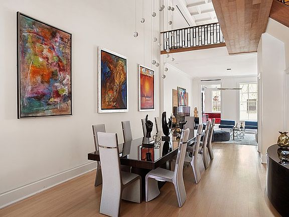 Spanning over 8,500 square feet, the residence offers five bedrooms, four full bathrooms, and multiple levels of elegant living and entertaining space. The parlor level features grand double-height ceilings, intricate millwork, and a dramatic mahogany staircase. A private elevator services all floors, including the lower level spa with a 33-foot lap pool, jacuzzi, steam room, gym, guest suite, and full bath.