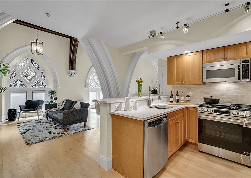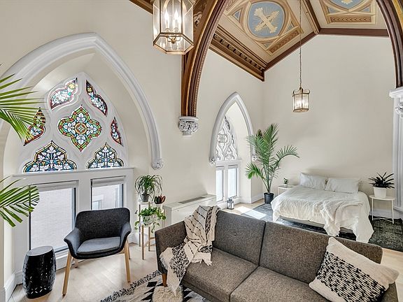 1-OF-A-KIND Condo located in a former Church in prime South Boston location just steps to the Broadway red-Line T stop! Timeless elegance meets the conveniences of modern living. This unique space has grand columns that accentuate its historic character, vaulted ceilings with the original hand painted pattern, & 4 gorgeous stained glass windows casting colorful patterns across the space. The open-concept space with hardwood floors throughout features a chefs kitchen with large quartz counter-top & breakfast bar. Gas cooking & lot of storage. In-unit washer& dryer, deep soaking tub, central A/C & custom closets. 1 DEEDED PARKING spot included. Low condo fee, perfect for owner occupant or investor. All in a well maintained professionally managed elevator building.