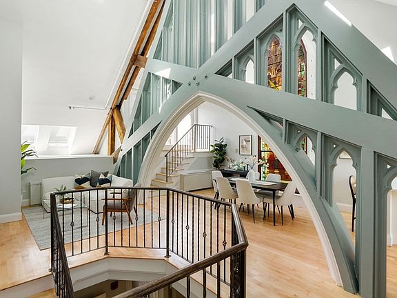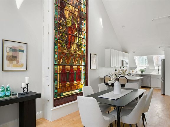 Welcome to the PH2 at 45 West Broadway. This is the first time this incredible condo has ever been offered for sale. It is truly one of a kind loaded in history and architecturally beautiful. Saint Peter and Paul church was built in the 1840s and many details remain. One of the most stunning features is an original stain glass close to 20 high in length. It is of Saint Cecilla who was the saint of music and arts. It will take your breath away. The condo has 2 bedroom suites with a sitting area and stairs to lead to a lofted bed, ceiling height sore to 20 feet. You must see to appreciate.