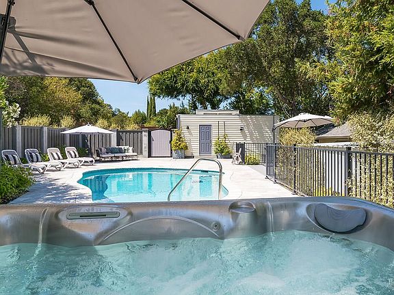 Price reduced! This Marin Country Club home offers 3BD/2.5BA plus a fully finished, detached garage and office with its own heat and AC. Possible ADU potential, this is also ideal for remote work, fitness, or hobbies. Nestled on a private street overlooking a championship golf course, this 2-story contemporary home is turnkey and features about $250,000 in recent upgrades. Newer roof, furnace, AC, decks, fences and more. Spend mornings playing golf or hiking trails, afternoons poolside in your remodeled saline swimming pool, and evenings in the spa. Inside the house, vaulted ceilings and hardwood floors throughout create a sense of volume and warmth, while large windows capture natural light and frame views of the green fairway. The home offers easy indoor-outdoor living with sliding glass doors and decks connecting the entertaining spaces. The remodeled kitchen is a nod to European design with clean lines and Miele stainless appliances, including a steam oven. A custom glass breakfast bar that fits perfectly in the space is included. All 3 bedrooms are downstairs, including a spacious primary suite with a California Closet system. An under-house storage room offers potential expansion opportunity. Room for 3 cars or RV on the driveway.