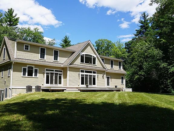 Beautiful custom cape style home set on over 13 acres abutting conservation land with your own private pond &waterfall. Gleaming hardwood floors throughout. Gorgeous 2 story living room with Fireplace, wall of windows overlooking the pond, and stunning cathedral ceilings with sky lights. Gourmet kitchen ideal for entertaining with stainless steel appliances, custom cabinetry, extra large island and miles of granite counter tops. 1st floor dedicated laundry room, walk in pantry, and prep room. 1st Floor Master suite has with water views, door to the deck, huge walk in closet and private bath with glass shower and jetted tub. Picture paneled office with French doors completes the first floor. Upstairs finds a Balcony sitting room, 2 additional bedrooms and a second master suite. Partially finished walk out basement offers family/game room and plenty of easy access storage. Farmer's style front porch, stone steps, rear deck, and private wooded setting. This Hollis home is a MUST SEE