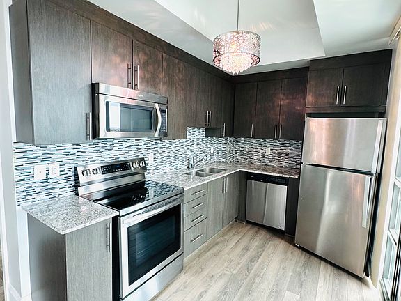 Wow Welcome Home To This Corner Unit, Lots Of Windows, 2 Bedroom + Den (Den Features An Open Concept, With Storage/Spacious Cabinet - Great To Set Up Home Office Or Study Area). Unit Includes Stainless Steel kitchen Appliances, Granite Counters, Kitchen Backsplash, Laminate Flooring Throughout, 9Ft Ceiling, W/O To Balcony From Kitchen Area, Upgraded Light Fixtures, & Sink In Laundry Room Area. Do Not Miss The Opportunity To Move Into This Cozy & Comfortable Condo & Call This One Home Sweet Home.