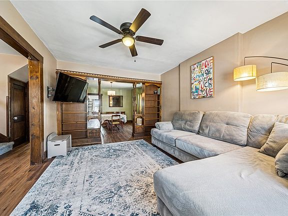 staircase. The spacious living room is filled with natural light & features wooden built-ins. Enjoy a large dining area &