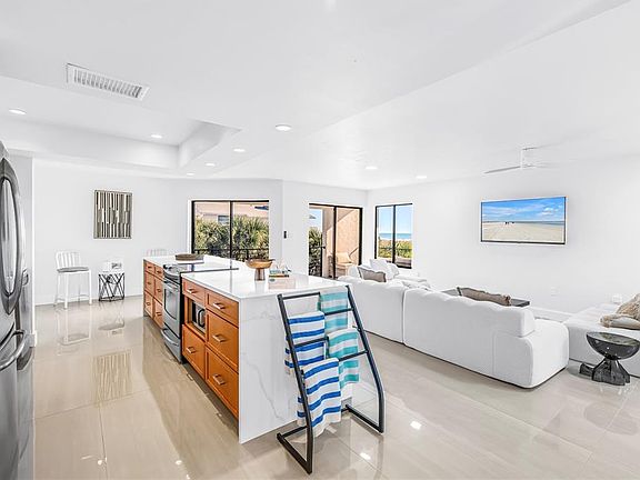 Welcome to 450 Beach Rd Unit 4, a rare opportunity to own a completely remodeled 2025 coastal retreat just steps from the sugar-sand shoreline of world-famous Siesta Key Beach. Located within an intimate five-unit complex, this 3 bedroom, 2 bathroom condominium offers deeded beach access, sweeping Gulf views, and weekly rental flexibility. The interior was fully renovated in 2025 and features a bright, open layout designed for effortless coastal living, complete with sleek tile flooring, marble countertops, stainless steel appliances, and a seamless flow between the kitchen and living areas. Gulf views can be enjoyed from the kitchen, while the private balcony provides the perfect setting for morning coffee or sunset unwinding. Additional conveniences include one open parking space plus an enclosed one-car garage. Recent exterior improvements to the building and grounds include fresh paint, modern balcony railings, Italian terrazzo tile, contemporary privacy fencing, and luxury outdoor lighting, enhancing the curb appeal of this boutique property. Residents and guests enjoy a well-maintained shared pool and an entertainment area with a grill, ping pong table, and cornhole. Just a short stroll to Siesta Key Village, this property offers immediate access to dining, shopping, and nightlife while maintaining a private, resort-style atmosphere. Ideal as a full-time residence, second home, or high-performing investment, this property blends location, luxury, and income potential.