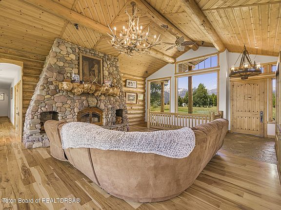 Designed by Dubbe-Moulder Architects, this striking Bar B Bar home sits on one of the most iconic view corridors in Jackson Hole, with uninterrupted panoramas of the Grand Teton, Sleeping Indian, and Curtis Canyon. The architectural structure is composed of hand-hewn lodgepole pine logs, anchoring the home in classic Western craftsmanship while offering warmth and scale throughout. Inside, a thoughtful layout of 4 bedrooms and 3.5 baths unfolds across natural stone and wood floors, with river rock fireplaces and burlwood mantles in the great room, primary bedroom, and den. Expansive windows bring the Tetons into every room, while redwood porches on both sides of the home provide immersive outdoor living.