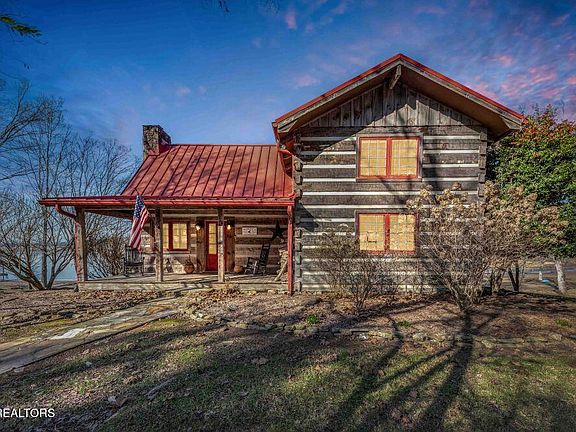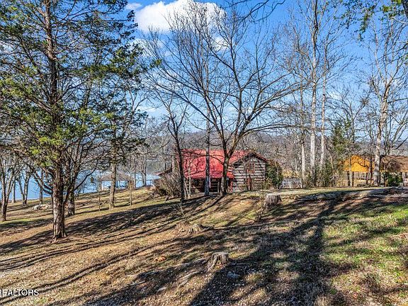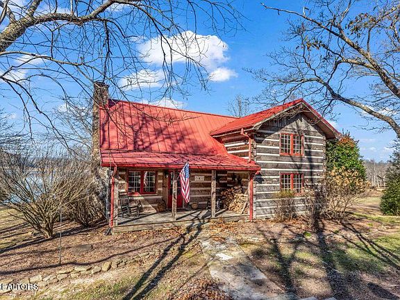 Tennessee lakefront property with amazing sunsets on Watts Bar Lake. True log cabin with modern amenities. The living room boasts hardwood floors, exposed beams, tongue and groove celing, and a stone woodburning fireplace for those cool evenings. The kitchen has a stainless steel dishwasher, oven/range, and microwave. Master bedroom on the main level opens to the laundry room and a full bath. 2 bedrooms upstairs share a walk-in tiled shower with stone floor and glass doors. The oversized formal dining room with stone floors overlooks the large, screened porch. Both rooms have great views of Watts Bar Lake. Level backyard leads to 38 x 37 covered dock with lift for a boat and jet ski lift. Home has been on a rental program so it is a proven income producing property. Tennessee lake living at it's best!