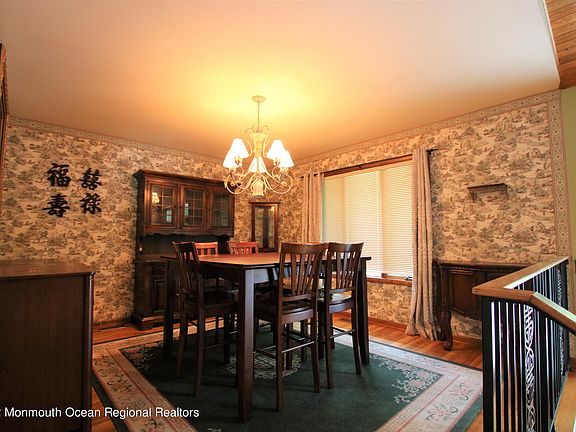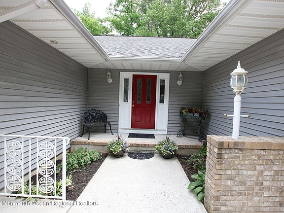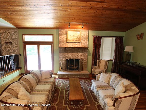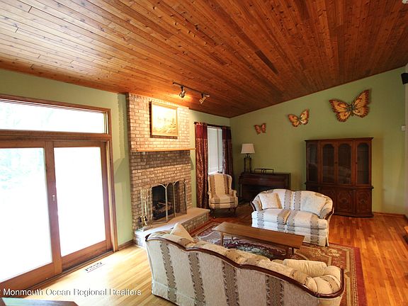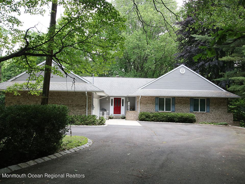 Private Lincroft Oasis! Don't miss this expansive 4 bed, 3.5 bath Custom Raised Ranch with 2-car garage and full basement handsomely set on an sprawling 1.47 acres backing to lush wooded views! An open concept floorplan opens to a warm and inviting Living Room adorned with cedar plank vaulted ceiling, wood floors, and brick gas fireplace, raised Dining Room, and spacious Eat-in-Kitchen with center island and Oak cabinetry. A serene Master Suite offers walk-in closet and full bath with double sinks, walk-in shower and Jacuzzi tub. Full Basement is an entertainer's delight boasting Family Room with woodstove, Wet Bar, storage closet, and sliders to your patio overlooking the parklike yard with Gazebo. Finished with attic for storage, 2-Zone heat/c-air and so much more call today!