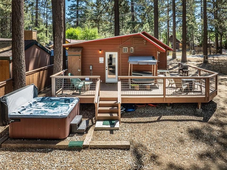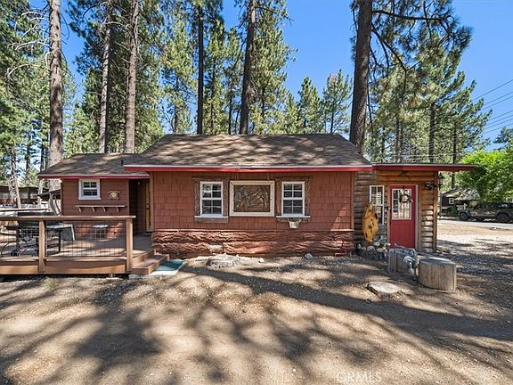 A fully renovated original Hunter’s Cabin that blends rustic charm with modern upgrades. In addition to the main living area, there’s a versatile room with approximately 200 sqft of living space — perfect as a kids’ bunk room, guest quarters, or bonus lounge. There’s ample space for a boat, RV, and all your adventure gear, making it as functional as it is charming. Inside, you’ll find a bright and inviting living space with laminate and tile flooring, wood blinds, a remodeled bathroom, and new ductless HVAC (mini-split) for year-round comfort. The upgraded kitchen features granite countertops, stainless steel appliances, and a gas connection in the living room to attached the wall heater stored in the storage, ready for winter. The open layout flows to a wrap-around deck ideal for morning coffee, evening BBQs, and enjoying Big Bear’s crisp mountain air. Outdoor living is where this property truly shines. Perfectly located just a short stroll to the lake and minutes from all Big Bear has to offer, this R-3 zoned property not only delivers a picture-perfect mountain escape, but also the potential to add another cabin. Relax in the newer Jacuzzi spa, gather around the gas firepit, or enjoy the privacy of a 150-foot redwood fence. Two oversized sheds provide generous storage, while included furnishings make this home completely turn-key. With proven vacation rental income potential and a location just an 11-minute walk to Santana Mavericks Bar & Grill, this cabin is ready to be your weekend retreat, full-time home, or investment opportunity.
