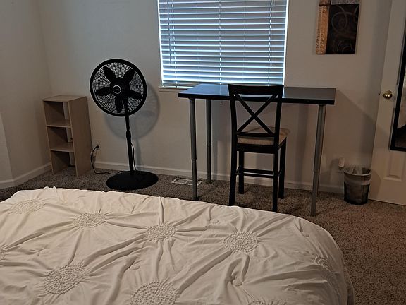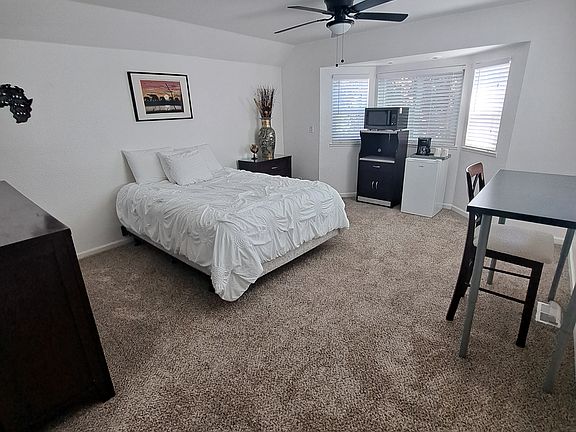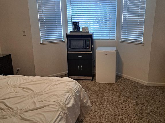 This UPSTAIRS bedroom has a microwave, a coffee pot, a mini refrigerator, a few plates, bowls, silverware and cups. Also includes a Portable AC, Bedding and Towels. Kitchen privileges are welcome