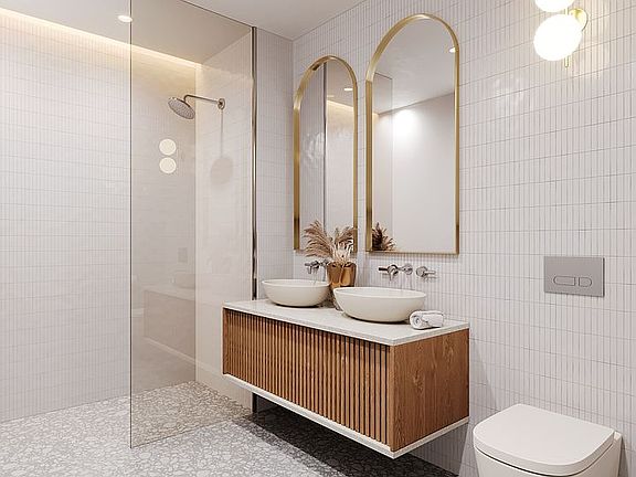 Open-concept living-dining is met by a top-of-the-line kitchen appointed with Caesarstone and Carrera white marble counters, lacquer-finished cabinetry, and a suite of premium Italian-made Bertazzoni appliances for the cook. Spacious bedrooms brightened by walls of glass provide generous closets and a tranquil place to unwind. Stunning spa baths are styled with pattered Terrazzo marble walls, floating stone-top vanities, and soothing tubs/showers with chrome fixtures. Other highlights of Residence 2F include HVAC, and private outdoor space.