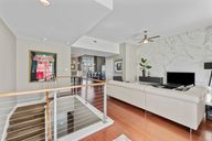 Open staircaseSleek modern railingSecluded patioPrivate balconiesSoaring ceilingsPorcelain accent wall