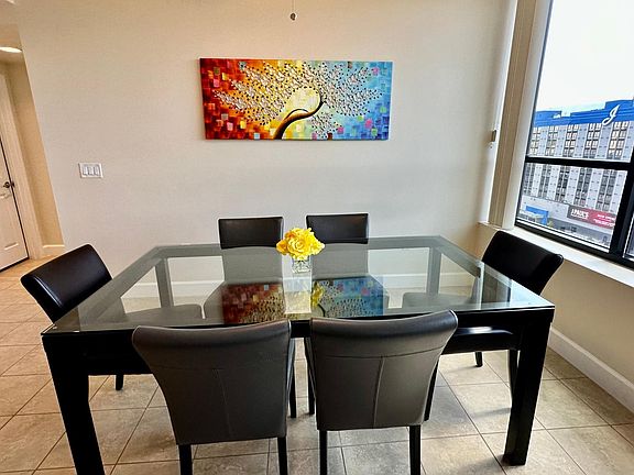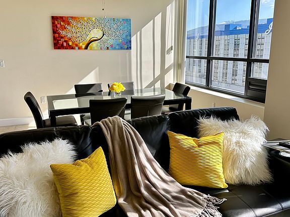 The unit is fully furnished and features: high ceilings, open floor plan with panoramic windows, fireplace, stainless steel appliances, granite counter tops and beautiful tile floors throughout the unit, jacuzzi tub with jets, lights with dimmers. Abundant storage space: 2 walk-in closets, 2 linen closets, and 2 coat closets at the entrance. Washer & dryer are in the unit. The unit is pre-wired for superfast AT&T Fiber GIG Internet. On premises, you will get to enjoy 24/7 fitness room with TVs; a large community room with lounge, kitchen, fireplace, and pool tables (for hosting a party); a media room with comfy chairs and sofas to watch your favorite movies on a big screen TV. There is 24-hour secured building access with a guard on duty & security cameras throughout the building, as well as secured on-site internal parking garage. The pool and hot tub are currently under remodel.