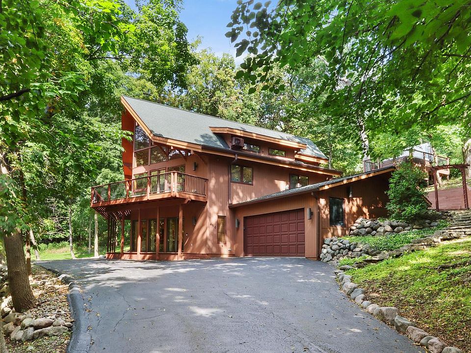Discover the perfect blend of lake living and mountain charm in this stunning Lindal Cedar A-Frame tucked among the woods in the Village of Fontana on Geneva Lake. Set in a storybook setting yet less than five minutes from the Fontana lakefront, this 4-bedroom home offers open, inviting living spaces ideal for entertaining. A unique ''treehouse'' hot tub sits elevated in the trees just outside the primary bedroom's sunroom, creating a one-of-a-kind retreat. Recent updates include all new flooring, beautifully remodeled bathrooms with a first-floor steam shower, extensive landscaping, and more on nearly 3/4 of an acre. This home is truly a must-see to be believed!