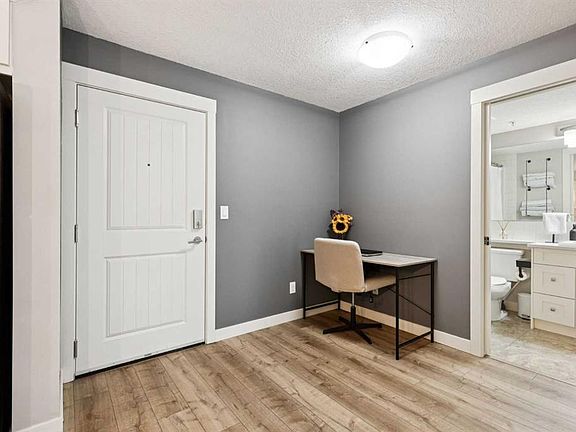 Welcome to Sage Place Unit #3103, where 581 sq ft feels remarkably spacious! This bright and inviting open floor plan is enhanced by a large NE balcony door, flooding the unit with natural light. Enjoy a sophisticated living experience with modern finishes, including upgraded lighting and hardware, elegant quartz countertops, and custom blinds in the primary bedroom. The tiled bathroom floor adds a touch of luxury, while the versatile flex space at the front entry offers additional functionality.The peninsula island not only provides ample prep space but also serves as a stylish seating area for hosting. You'll have the flexibility to create a dedicated dining area or expand your living room for even more comfort. Stay cool during the warm months with air conditioning—perfect for those 28 days a year when it's truly needed! The primary bedroom is generously sized, featuring a spacious walk-in closet and convenient access to the main bathroom. The double balcony, surrounded by mature landscaping, offers a rare sense of privacy and feels surprisingly expansive—an exclusive feature of the main floor units. Plus, your parking space is just steps away, located less than 10 feet from the balcony and positioned directly in front of the unit. With only one common wall, this unit provides a serene living environment. Don’t miss your chance to experience modern living at its finest in this stunning unit!