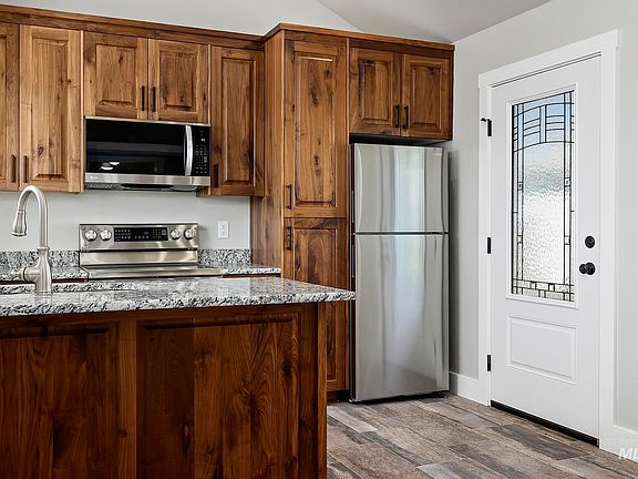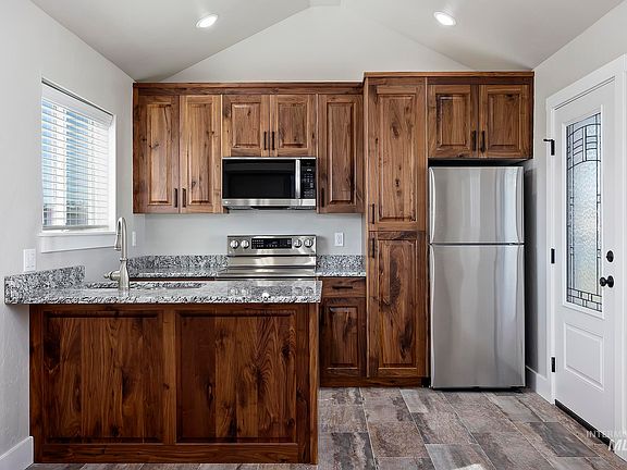 Beautifully designed 396 sq ft tiny home by Forrest LeBaron, where efficient living meets modern comfort! Built in 2024. This charming space features a spacious kitchen with custom cabinets and full-sized appliances, including a refrigerator, oven, and microwave, perfect for all your culinary needs. The bathroom offers a shower and the convenience of an included washer & dryer. Built with sturdy 2x6 exterior shear wall construction, this home is made to last, offering extreme weather insulation (R21 in walls, R30 in ceiling and floor) & energy-efficient windows for year-round comfort. Central heating and air conditioning provide climate control, ensuring cozy winters and cool summers. With 40-year roof shingles and LP SmartSide siding with 50-year life expectancy, this home is built for durability. Hand-textured, finished drywall. A spacious storage loft adds practicality to this thoughtfully designed space. Storage Shed included. Stay in the 55+ Lazy J Mobile Home Park or you could move it to your own land.