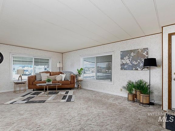 Welcome to this adorable, affordable double-wide mobile home in Lazy J Ranch, a wonderful spacious, well-kept, and clean mobile home park. Park is for 55+. Generous comfortable living spaces are rounded out with 3 bedrooms and 2 bathrooms. Built in ‘china’ cabinet. Functional counter can serve as coffee/beverage bar or buffet. Enjoy the outdoors under the covered front porch. Auto sprinklers. The exterior to be brightened with paint as soon as weather allows. This fantastic location on the north side of Twin Falls is near restaurants, shopping, the hospital, and I-84. Access the canyon trail via the path running UNDERNEATH Pole Line Rd! Space rent is $650/mo which affords city services (water, trash sewer), mowing of all areas the commercial rider can reach, road maintenance, and community mailroom. One small pet to be registered with Park. Buyer to be approved by Park prior to closing. Check with local building department on requirements if moving home is desired.